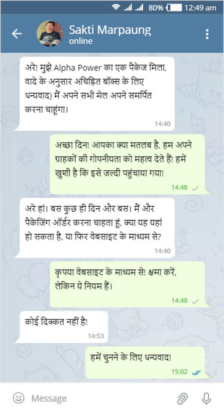100% गारंटी। आपका ऑर्डर किसी लोगो, टिकट या उत्पाद के बारे में किसी तरह की जानकारी के बिना, सलेटी रंग के एक बक्से में पैक होगा। मैं निश्चित रूप से इस चमत्कारी अल्फा पावर को उन लोगों तक ले जाने की सलाह दूंगा जो स्पष्ट रूप से अपने यौन सुख के अनुभव को बेहतर बनाना चाहते हैं। अब एक प्रचार है और आप से तक 50% छूट के साथ अल्फा पावर प्राप्त कर सकते हैं